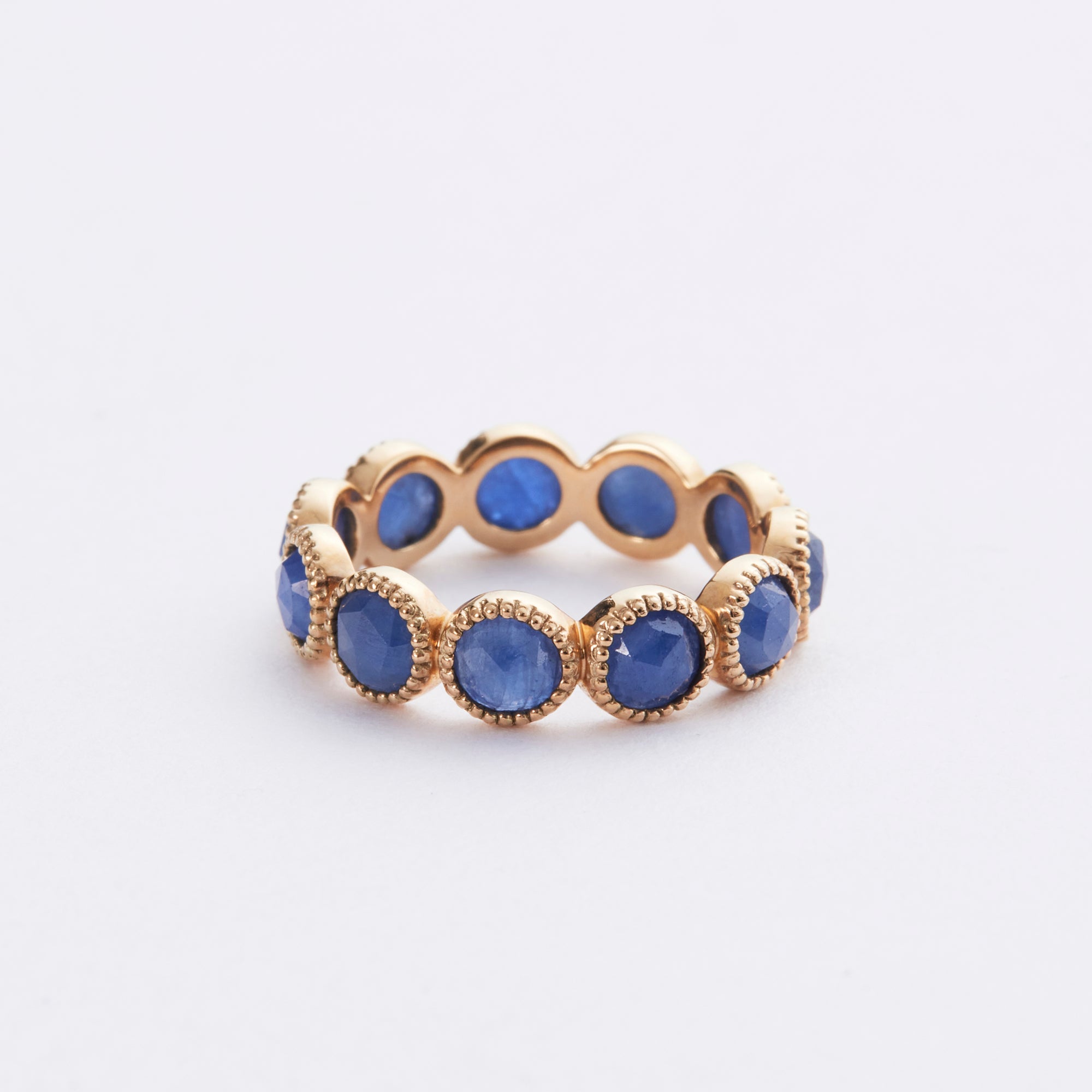 中世ヨーロッパの手法であるローズカットを施したストーンの周りをミル打ちのアンティークに仕上げ、たっぷりとした10kゴールドの美しいエタニティリングに仕立てました。